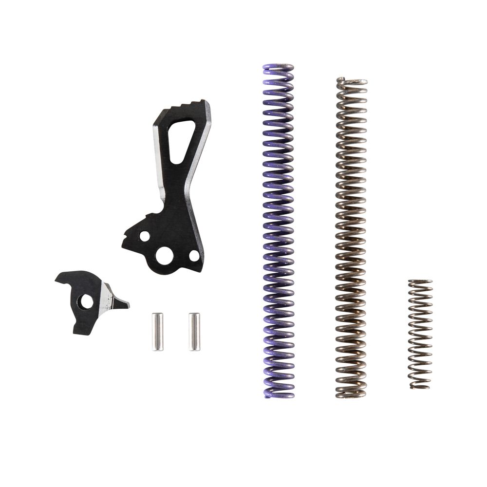 This Action Enhancement Kit for the CZ Shadow 2 reduces the double-action to single-action pull weight delta to approximately 2 lbs. The primary problem it solves is the abrupt transition between a heavy DA first shot and a lighter SA follow-up. The hammer and sear feature matched single-action engagement surfaces, eliminating the need for polishing or stoning. Use factory firing pin only — extended firing pins are not recommended.
