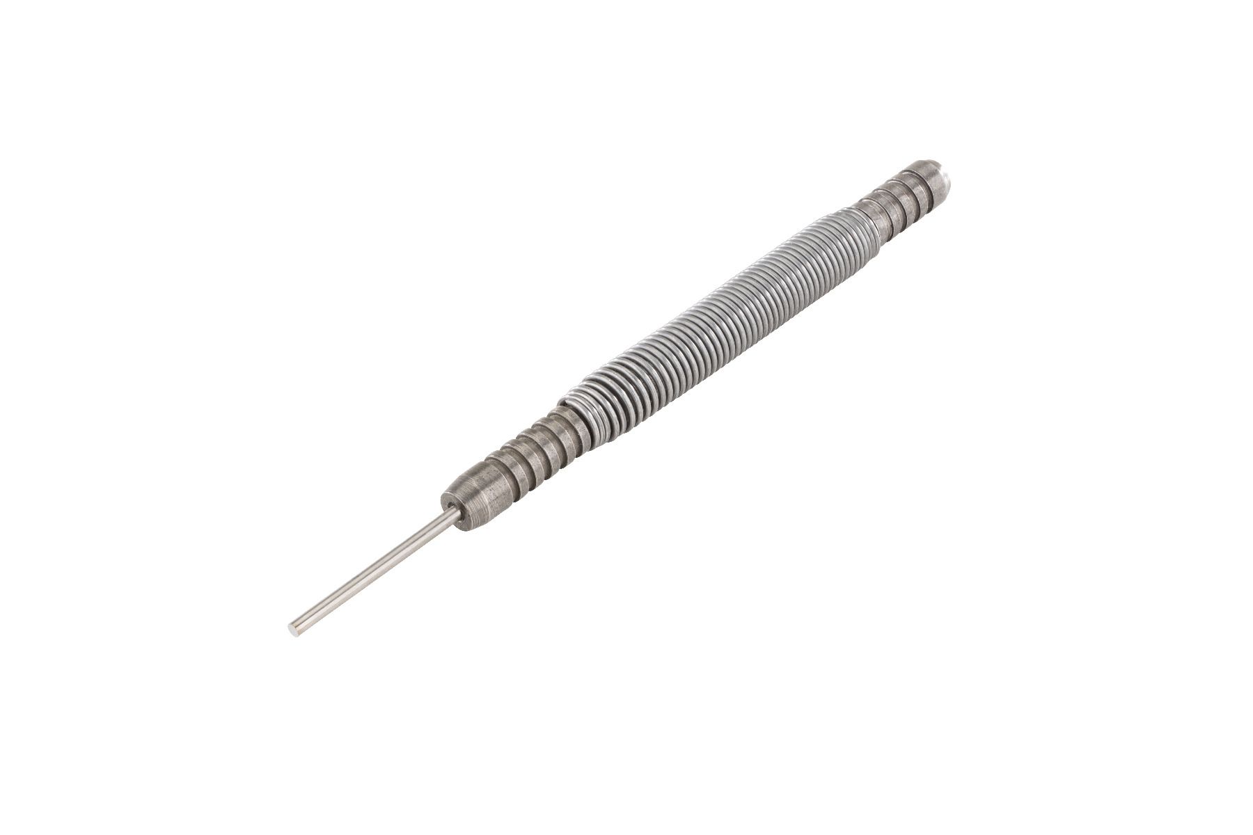 This is a spring-loaded disassembly punch with a 3/32″ flat tip, modified specifically to address the common difficulty of removing the front locking block pin on FN 509, FN 510, and FN 545 pistols. The factory pin is under spring tension and often requires multiple impacts with a hammer and standard punch, risking frame damage or pin deformation. This component applies direct, repeatable force to the pin face, freeing it with a few strikes when properly aligned. It replaces the need for a separate hammer and punch during detailed frame disassembly.