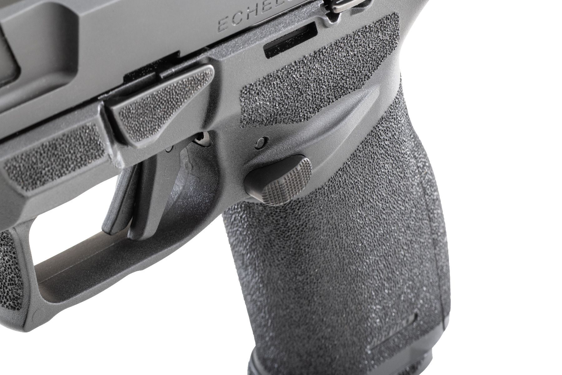 This extended single-sided magazine release is a direct replacement for the factory unit on the Springfield Echelon and Echelon Compact. It addresses two common issues with the OEM release: the need to break the grip to reach the button under speed, and the risk of an inadvertent magazine drop from holster pressure or gear snag. By extending the pad .060″ at the highest point from the frame’s grip shield feature, it reduces reach distance without adding bulk where it can interfere with holster fit. The single-sided design eliminates the chance of a cross-body bump or holster-induced release, making this component suitable for USPSA, IDPA, and duty use where retention and positive control are required.