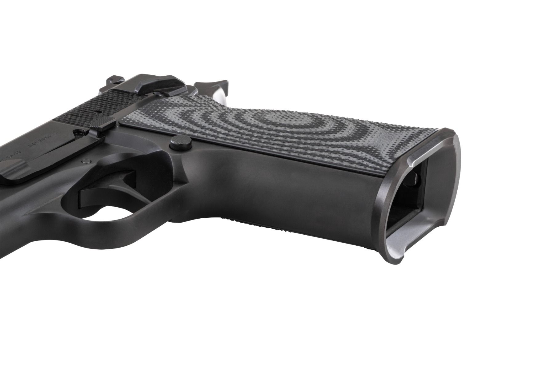 These G10 grip panels are machined specifically for the Springfield SA-35 fitted with the Apex Low-Profile Magwell. The primary function is to provide a textured, palm-swelled gripping surface while maintaining full clearance for the magwell body. Factory SA-35 grips typically interfere with aftermarket magwell installation or require modification; this set eliminates that issue with a pre-cut lower geometry that mates directly to the magwell profile. At 1.520″ across the widest point of the palm swell, these grips add measurable hand-fill without exceeding practical holster clearance.