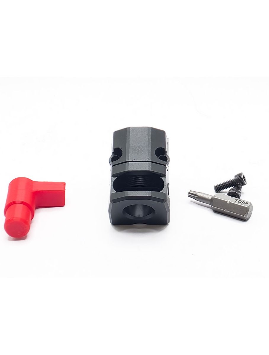 Tools required: 1/16” hex key (provided), torque wrench capable of 25 in-lb (recommended). Install time: ~5 minutes. Thread comp onto barrel hand-tight, align ports, torque clamp screws to 25 in-lb. No thread locker – do not apply any compound to threads or clamping screws. Removal is reverse process.