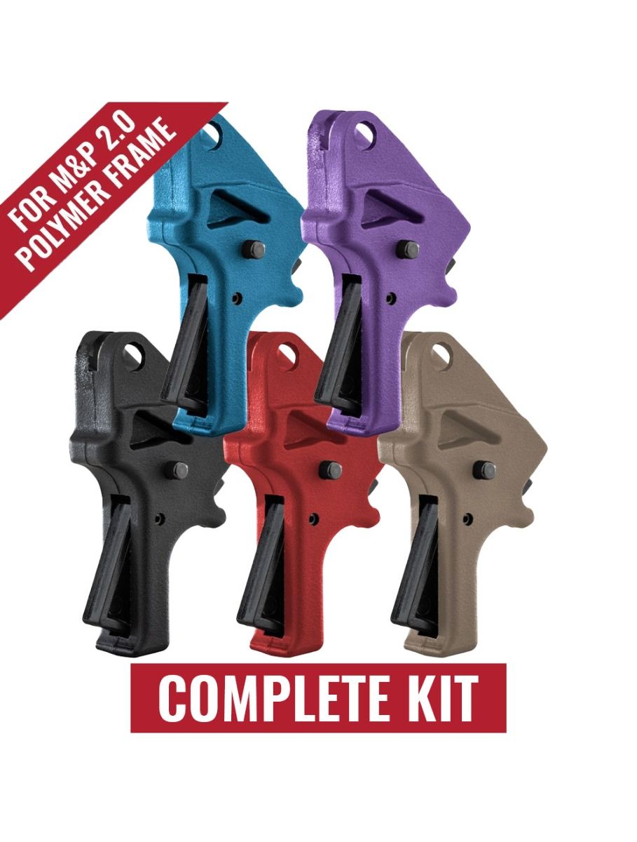This Polymer Flat-Faced Forward Set Trigger Kit reduces overall trigger travel by approximately 40% and pull weight by roughly 2 lbs compared to factory M&P M2.0 triggers. It addresses the long, gritty take-up and extended reset common to stock hinged triggers, providing a shorter, more predictable stroke with a defined wall and crisp break. The forward-set sear geometry reduces pre-travel and over-travel simultaneously, allowing faster follow-up shots without sacrificing positive sear engagement. Designed for duty/carry or competition use, the kit uses a combination of included springs and factory springs to let the user dial in pull weight within a range suitable for either role.